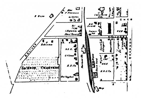 Riverside Cemetery as it appeared on the Beers map of Jackson/Madison Co., 1877. The 1878 addition to the cemetery is not yet noted (north to Sycamore Street). Suggested by the drawing is an eastern entrance to the cemetery and one to the direct south. For many years there was a small street called Strawberry St. just south of the cemetery, some of which is covered now by the Dement Company.