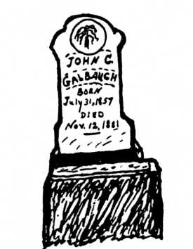 This rough drawing of the tombstone of JOHN C. GALBAUGH gives the readable inscription. Ingram James read the last number in the birth year as one but a flour-soil mixture, enhanced with enlarged photography, shows that it was a "7." Also, the day of death was "12" not 2 of Nov. I accept his reading of 1881 as the death year as I cannot now read the last digit of this date.