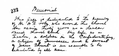 Your committee would, after conference with brethren, who knew our brother deceased, and also with his nearest relatives, beg leave to submit to you for your adoption an in memorium written by Rev. Dr. J. H. Evans, Presiding Elder of the Jackson District, it being the judgement of your committee, a full and most befitting tribute to the memory of himwhom we all knew so well and loved so tenderly.