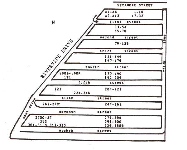 ADAPTED FROM THE RIVERSIDE CEMETERY MAP THAT WAS DRAWN BY EARNEST R. DIKE, CIVIL ENGINEER IN DECEMBER 1937. The numbers, above, refer to grave lot numbers, although most graves on the south slope have no number assigned to them.