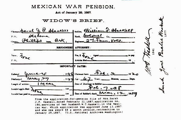 Mary Emma Cheatham Haskell, born Mar. 11, 1852From Mrs. Sarah J. P. Haskell's Mexican War application (1887), no. 186 . . . She wrote that from her husband's death until 1871 she lived in Memphis, Tenn. and from 1871 until Feb. 1879 she lived in Nashville, Tn. Thereafter, Helena, Ark. In proving her marriage to Haskell, "In relation to the family Bible of Joshua Haskell decd. she states that she & her said husband received the same after the death of the said Joshua Haskell; that she had often seen the same in the possession of the said Joshua; that the record of the marriage of herself and said husband was made by her said husband shortly after their marriage." Wm. T. Haskell and Sarah J. P. Porter on the 7th of February 1838 at Paris, Tenn. The clerk noted, "the said Bible . . . was printed as shown in the first page 1814." Ostensibly this is the Bible from which comes the Haskell data, mentioned above, now in the Tenn. State Library and Archives, Nashville.