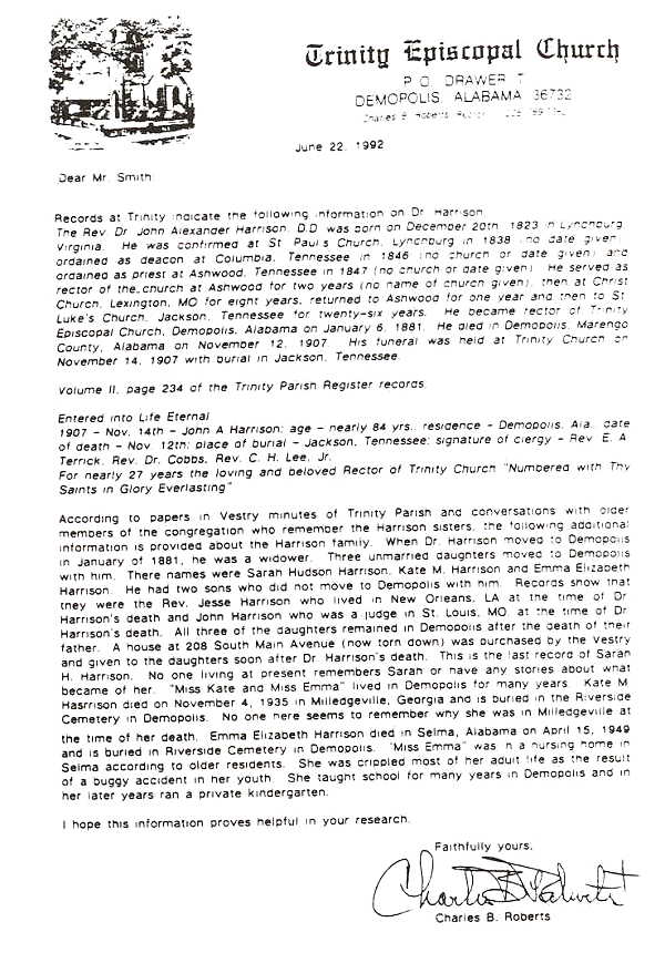 Mrs. Theus was a devoted member of the Baptist church and her name will go down in the annals of that church here as one of its staunchest supporters. As before remarked, she was a woman of great individuality and although her forefathers came to this country in the reign of Louis XIV when the edict of Nantest was revoked, no born daughter of France ever had more markedly the characteristics of that country and her servant maid had almost as much French mannerism as her mistress. Her dignified old coachman, Uncle Moses, who never drove her carriage horses out of a walk through the town, was a strange mixture of French and African. He had been bought fresh from a slaver and while an excellent and courtly old servant, he retained to the last many of his native words and Mrs. White relates that as far back as her memory goes, Uncle Moses called her banky Mary for Miss Mary. Mrs. Theus died in 1868 and though 75 years of age was as active on her feet as a girl of 16 and about three months before her death she danced the minuet for her granddaughter to show her, she said, how to dance, for she did not think the younger generation understood much about it. Dr. Womack, her son-in-law, to whom she sold the property was also a representative citizen of Madison County and of Jackson. He came from Pittsboro, N.C. and was a graduate of the then famous Chapel Hill College. He came to Tennessee in the forties and settled in the Denmark neighborhood, where he practiced medicine until 1859 when he moved to Jackson and continued the active practice of his profession until about a year before his death in 1873, when his health failed him and in 1874 he died. In 1884 Mr. N. S. White remodeled and added to house. . . . When the present house was built it was the last residence on the south side of Main Street this side of the Mcree place and there were no houses on the opposite side higher up than the place where col. Thos. Polk's residence now is, we make no apology for the long digression from the house itself to the people who lived in it, for after all a house is the family who build and occupy it, at least so far as its human interest go, and the most lovely marble halls have a soulless interest without human association.
