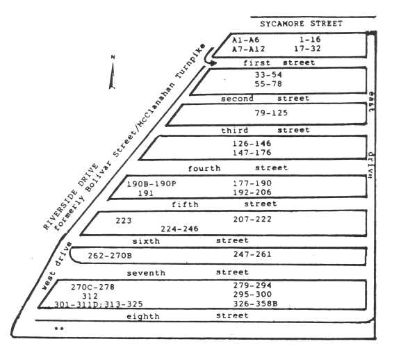 **The numbers above refer to grave lot numbers; not all the lots south of eighth street were marked by number; to avoid confusion in locating graves in this area, one should check the Riverside Cemetery survey, sheet C, a copy of which is in the Tennessee Room, Jackson/Madison County Public Library