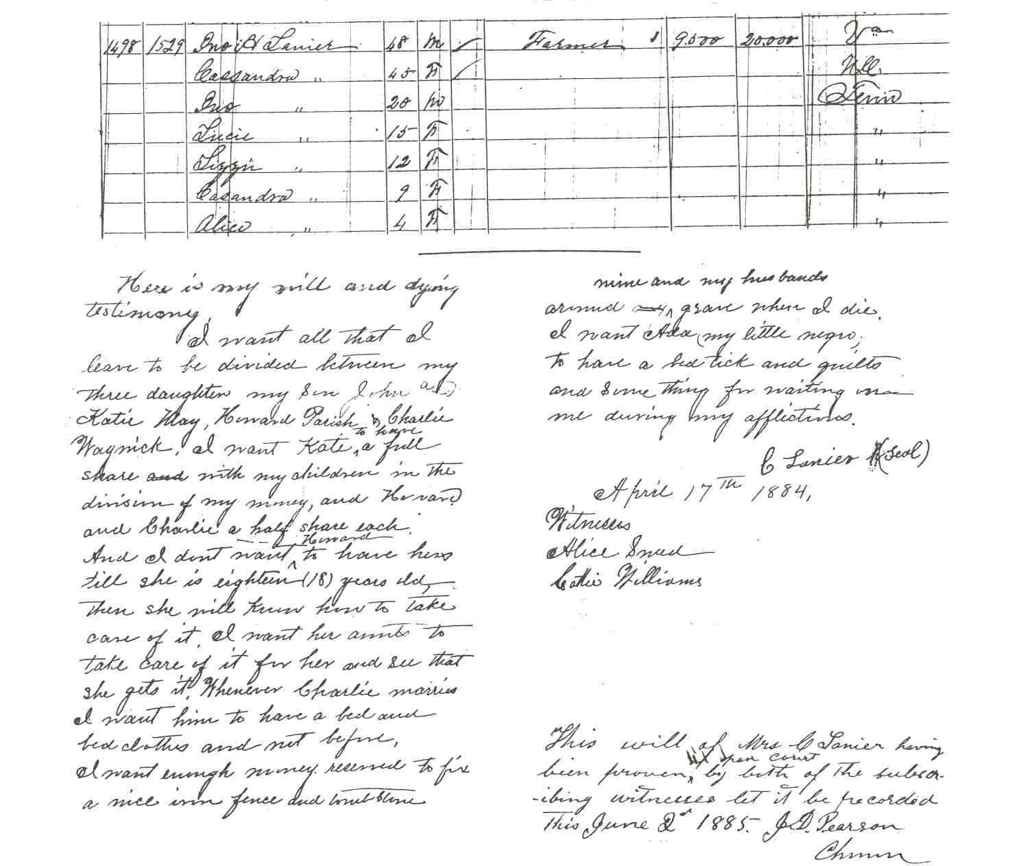 Copy of original will-testament of Cassandra Lanier, beginning with "Here is my will and dying testament."