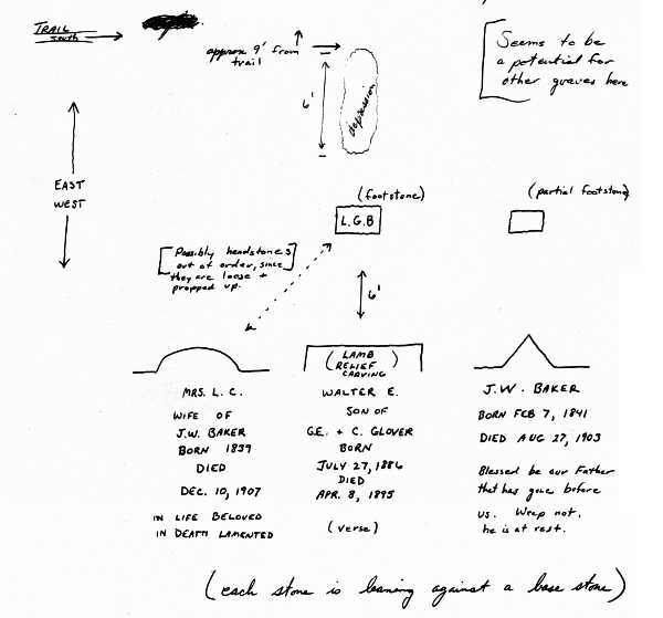 Lead from Rhonda Freeman, April 21, 1994Baker-Glover Cemetery is located in the woods at the southern end of Bourne Park, Oakfield Rd. Follow clear trail about 500 yds. (?), cemetery is on the right.