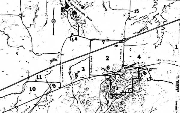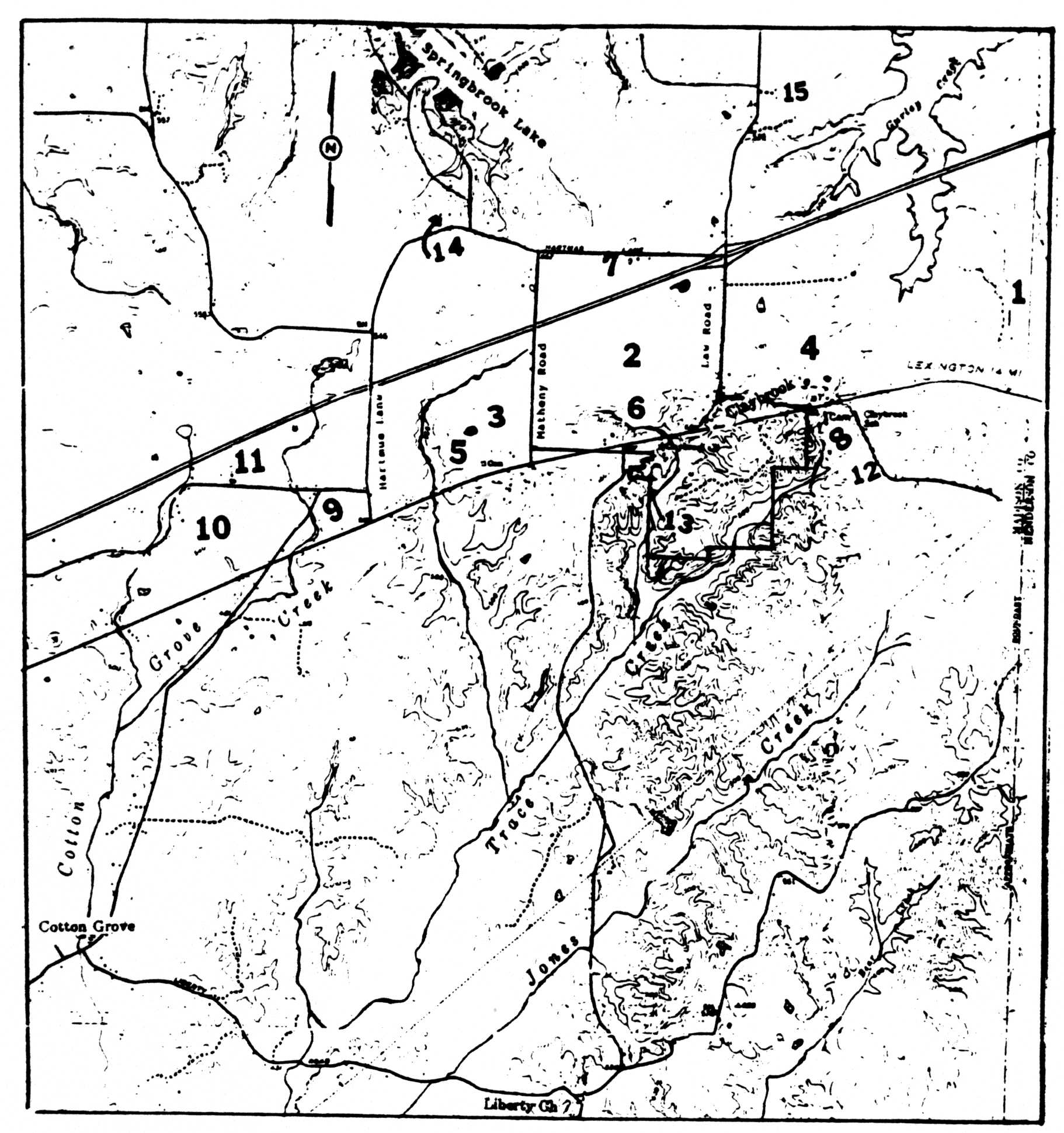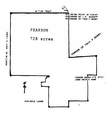 Shown on the topographical map (U.S. Geologic Survey) on page 10 are particular places of interest in the Liberty-Claybrook community. It is accompanied by a plat drawing of the Pearson 728 acres, drawn by James H. Hanna, Civil Engineer (Ret.), Jackson, Tennessee (July 1993); from the survey of 1891 and supplementary deeds. This is the remnant 728 acre tract of the original Goodrich 1000 acres. The original 1000 acres extended to the east of Law Road, shown on the topographical map — those portions owned at different times by Barnetts, Weirs, Doaks, Sykeses and Thomas F. Berry.