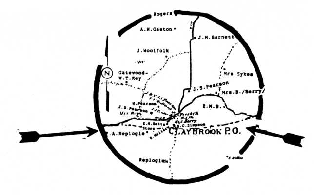 CLAYBROOK, as a distinct entity dates to 1868, the year a post office was established there. It is not definitely known who suggested the name Claybrook or exactly why the name was chosen for the settlement. Its list of postmasters is given on page 13.