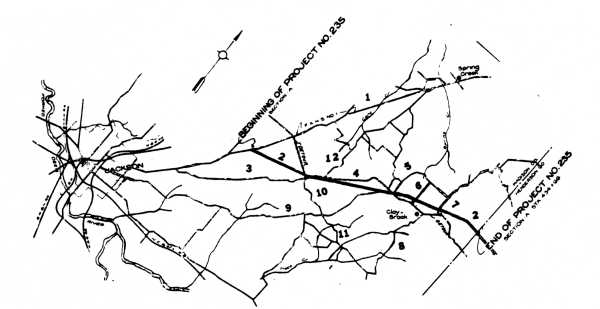 "PLAN AND PROFILE OF PROPOSED STATE HIGHWAY FEDERAL PROJECT NO. 235 from State Route 1 to Henderson County line (8.278 miles) — Now St Highway 20 and U.S. 412. Approved by the State Commissioner of High and Public Works, June 1930 and completed February 9, 1931. Sullivan, and Hagerty, Bessemer, Alabama, road builders, responsible for grading bridging and hard-surfacing of this highway. |