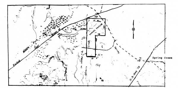 Location of the Samuel Taylor 160 acre tract near Spring Creek, drawn from the deeds relating to this tract, by James H. Hanna, Civil Engineer (Ret.), Jackson, Tennessee. |