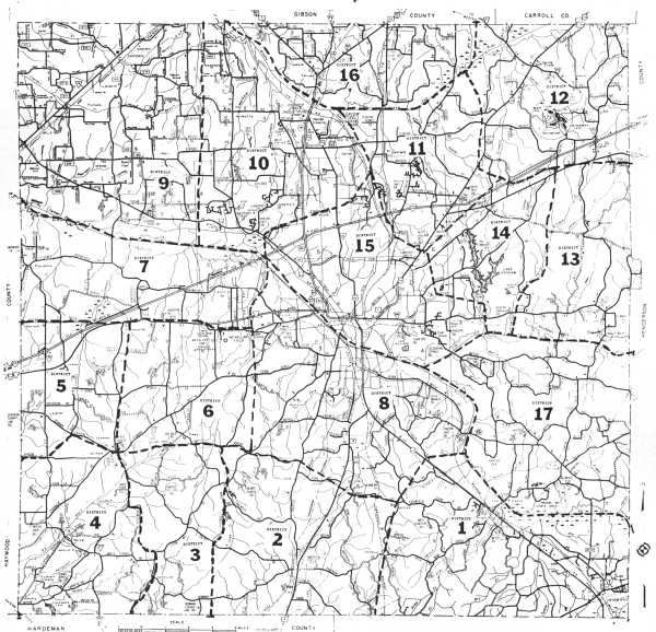 MAPS OF MADISON COUNTY, TENNESSEE HISTORICAL AND GENEALOGICAL, James H. Hanna MAP 7. 1840, 1850, 17 CIVIL DISTRICTS Note: In 1840 the 17 districts existed, but the census was countywide rather than by district. Return to Contents
