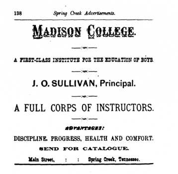 Those students in attendance at Madison college, 1859-1860, from its catalog, cited by Emma Inman Williams in an article, "Madison College at Spring Creek", THE JACKSON SUN, December 3, 1944: S. M. Allen, J. O. Askew, T. H. Askew, Joseph Askew, J. Bradbury, G. T. Barksdale, G. Burrow, Eugene Brooks, E. H. Crook, G. H. Camp, W. S. Clampit, F. M. Dill, F. S. Deener, W. L. Eddins, D.H. Grant, Lafayette Grant, Hezekiah Gray, J. A. Gooch, W. P. Godwin, T. H. Godwin, C. Gray, J. C. Holloway, M. W. Harris, John S. Harris, S. C. Hear, J. N. Harrell, A. G. Haighton, L. R. Irby, P. S. Irby, H. H. Jones, Matthew Jones, H. F. Jones, J. W. Key, D. Lacy, A. J. Miller, T. N. Maxwell, J. T. McNeeS, T. B. Mills, M. H. Owen, B. F. Prewett, W. H. Prewett, John Porter, S. W. Puckett, John Richardson, J. P. Ragan, Thomas V. Rhodes, Butler Rogers, J. B. Staley, T. C. Skinner, T. R. Short, B. C. Simmons, G. S. Strayhorn, Alphonson Strayhorn, Leroy Strayhorn, R . L. Smith, T. H. Smith, G. W. Tatum, William E. Trahern, J. V. Woods, J. G. Woolfolk, F. Wood, R. A. Williford, W. M. Whitelaw, J. M. Withers. (The 1860 U.S. Census, Madison County, Civil District 12, also lists J. J. Miller, as a student, age 21, native of Kentucky.)