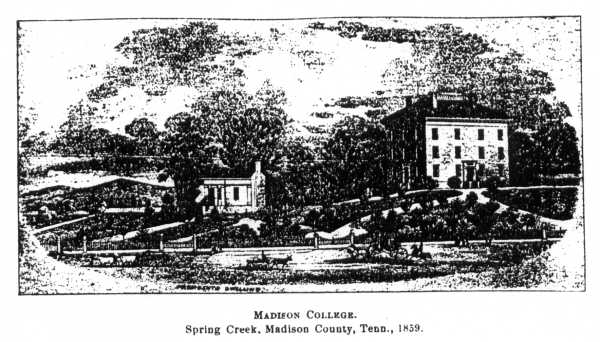 Through the enterprising efforts of several influential citizens, including James H. Otey, Episcopalian bishop; Leonidas Polk, William Stoddert, James J. Alston and Samuel Dickins, the Tennessee legislature passed a law chartering Madison College, December 20, 1837. It was to have been administered through a board of trustees and would offer academic degrees of bachelor of arts and master of arts; "said college" /to/ be established in Madison County, this State." (ACTS OF TENNESSEE, 1838, Chapter 218, pages 315-317) Apparently this movement to establish a college in Madison County failed to get beyond the planning stages.
