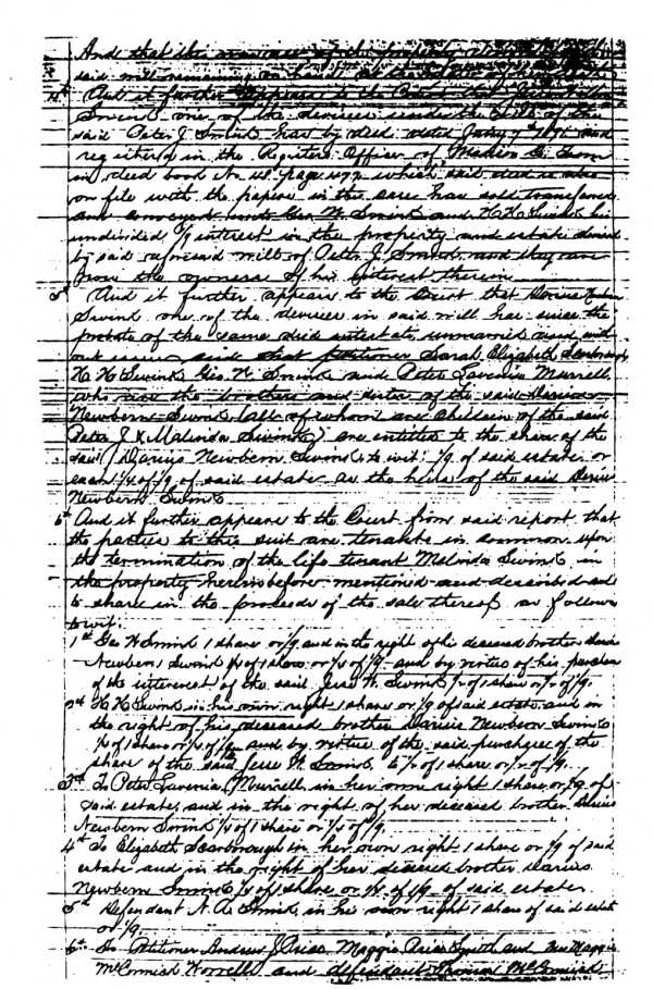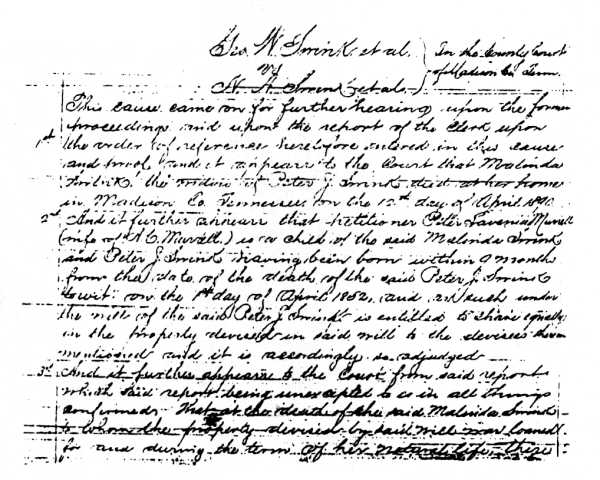 After Milla Swink's death, her son, George W. Swink, was appointed the administrator for her estate, January 13, 1891. (Madison County Court Minute Book 18, page 429) It was recorded in this action that she had died April 13, 1890, leaving a personal estate worth about $500. On March 2, 1891 the court considered the proper manner to distribute her estate, having been the widow of Peter J. Swink who on September 15, 1851 executed his last will, providing her with a life estate in all his property which at her death or remarriage was to have been divided among certain ones of his children as stipulated in his will. Again, her death date was given as April 13, 1890 and the court ordered the county court clerk to investigate the circumstances of the Swink estate and to report the results to the court. (IBID., pages 446-447) On March 11, 1891 the clerk's report was presented to the court, providing the details given in ibid., pages 448-452, which copied pages are reproduced on page [46] of this publication.