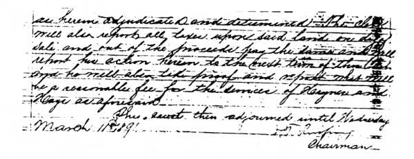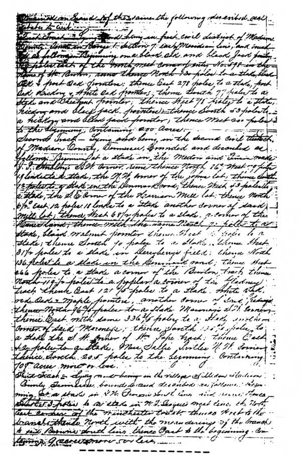 George W. Swink and Henry H. Swink, partners in a successful mercantile business (Swink Brothers Company) in Medon since 1876 bid $3000 for the 9 acre homeplace and the 709 acre farm which was confirmed to them, April 8, 1891 (IBID., pages 476, 484) and they bid for the 200 acre tract also, offering $250 for it but W. P. Harris had made an initial bid of $20 and the court decided that this tract should go to Harris but for his improved bid of $105. (IBID., pages 476, 486) Robert W. Haynes and S. D. Hays, lawyers involved in settling the estate, were allowed $150 in fees. (IBID., page 487) Mrs. P. A. Westbrook was appointed guardian of Jenny H., Ada and Ida Evans, beneficiaries, by the Johnson Co., Texas court where they lived, Feb. 8, 1892 which provision was recorded in Madison County, May 5, 1892. (IBID., Book 19, page 58)