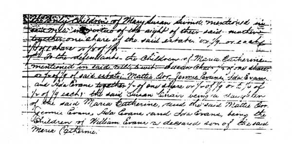 After the children named above as his heirs had each received a share amounting to $1200 (these being his younger children), any remaining estate was to be divided among all his children, including the sons whom he had bequeathed cash. He provided, under the laws of the time that Melinda's legacy from her father's estate, at her mother's demise, should be used for the "use and benefit" of her and her children. He appointed David D. Newbern as executor of his will. (IBID., pages 104-107)
