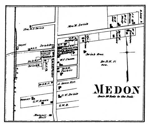 Map of Medon, Tennessee from the Map of Madison County and Jackson, Tennessee, by D. G. Beers, Philadelphia, Pennsylvania, 1877. At the upper left-hand corner is noted the homeplace of Mrs. M. S. Swink, now the residence of Robert and Leola Cummings. Various Swink properties are noted on this map, including house sites of G. W. Swink (before he made his home with his mother), H. H. Swink and the long shaded rectangle on the east side of Main Street that indicates the site of the large, brick Swink storehouse.