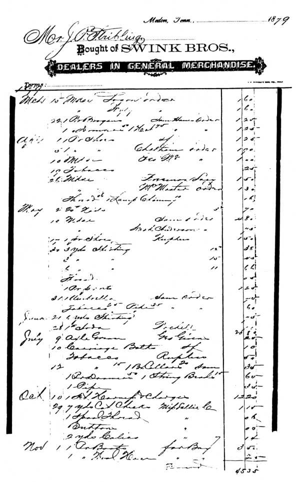 1879 Sales Ticket to J. P. Stribling, from Swink Bros., Medon. Courtesy of John L. Rochelle.