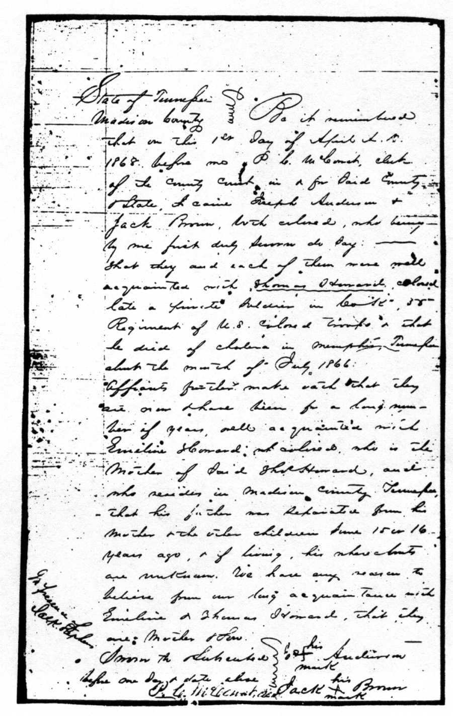 State of Tennessee Be it remimbered that on this 1st day of April A.D. 1868 before me P. C. McComish(?), Clerk of the County Court in the said County & State, came Joseph Anderson & Jack Brown, both colored, who being by me duly sworn do say: That they and each of them were well acquainted with Thomas Howard, colored late a private soldier in ____ 35(?) Regiment of U.S. Colored Troops & that he died of cholera in Memphis, Tennessee about the month of July 1866. Affiants further make each that they are or have been a long number of years, well acquainted with Emiline Howard, colored, who is the Mother of said Thomas Howard, and who resides in Madison County Tennessee, that his father was separated from his mother & the other children some 15 or 16 years ago, & if living his whereabouts are unknown. We have every reason to believe from our long acquaintance that Emiline & Thomas Howard, that they are Mother & Son. |