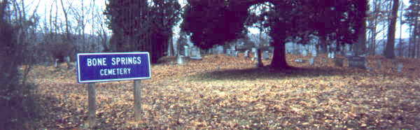 David Donahue recorded Bone Springs Cemetery January 14, 2000 and checked and updated it August 23, 2004. Mary (Stewart) Bowen and Melissa (Snyder) Bowen recorded the cemetery in the early 1990s. Their record appears in Mary Bowen's Perry County, Tennessee Cemetery Records (Vol. I). This earlier record is referred to as Bowen in the notes below.