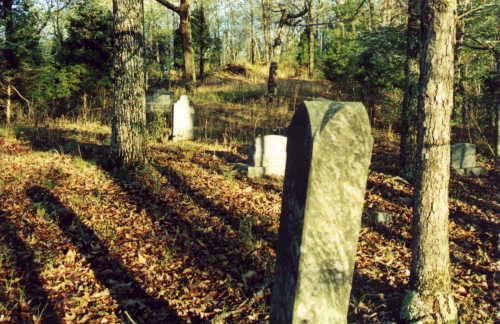 This is the unnamed cemetery on the U.S.G.S. Pope quadrangle just northwest of the Richardson Cemetery on state highway 100 (now U.S. 412). To find it, park at the Richardson Cemetery. Walk about 150 yards west along the highway until you cross a concrete box small culvert. Turn right onto the driveway just beyond the culvert. About 20 yards north the drive splits, with one branch turning west and the other continuing north along the stream. Between them, curving up the hill is the overgrown access drive to the cemetery. The access drive circles to the west as it climbs. The cemetery appears to have been abandoned. David Donahue recorded this Choat Cemetery December 25, 1988 and revisited it April 16, 1999.