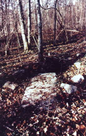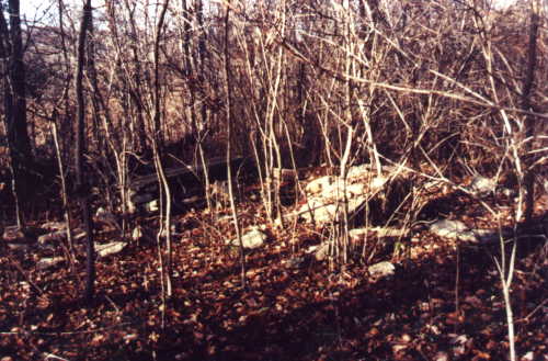 Randel Cemetery is a very old and relatively large cemetery. It is the unnamed cemetery on Flowers Branch on the U.S.G.S. Pope quadrangle between the Woods-Treadwell Cemetery (called Bunch Cemetery on the map) and the Flowers Cemetery. This cemetery was abandoned more than a century ago. In addition, grave robbers have destroyed much of what survived neglect. There are nine or ten of the above-ground burial cairns here. It appears that some time in 1988 a group a people got together here to drink beer and plunder the cairns. All of the cairns had been broken into and dug up. Many fieldstones are still visible. Only two tombstones were found. It is possible that more might be found through a careful search through the weeds, leaves, and brush. Both markers found, though toppled, were in good condition. The cemetery is large enough to have contained over 100 graves. Recorded on December 25, 1988.