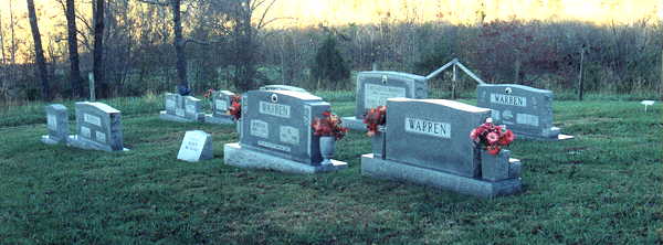 Warren Cemetery is a well-maintained family cemetery located on a hill overlooking the valley of Rockhouse Creek. The access road joins Rockhouse Creek Road to the south about a mile east of Warren United Methodist Church. There appear to be one unmarked grave. David Donahue recorded Warren Cemetery October 28, 2001 and checked and updated it September 30, 2004.