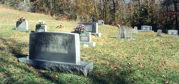 David Donahue recorded Duncan Cemetery October 28, 2001 and checked and updated it September 26, 2004. Mary (Stewart) Bowen and Melissa (Snyder) Bowen recorded the cemetery in the early 1990s. Their record appears in Mary Bowen's Perry County, Tennessee Cemetery Records (Vol. I). This earlier record is referred to as Bowen in the notes below.