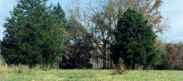 Part of the cemetery has been fenced in, Jennie Sharp is in this area. It is overgrown with several trees. The area is used for pasture. Mollie's grave is near a tree in the unfenced area.