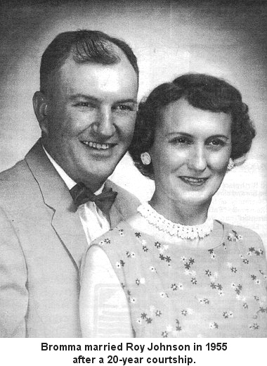 After all of BROMMA’s brothers and sisters married and left home, she stayed on to care for her parents. She met the love of her life, ROY JOHNSON, in 1935 when both were cast in lead roles in a play presented by the First Methodist Church. It was the beginning of a 20-year courtship.