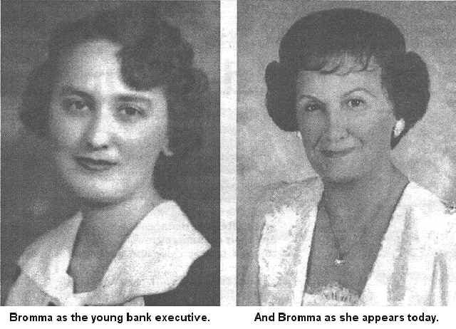 BROMMA thoroughly enjoyed her work at the bank. She had a strong work ethic and was highly committed to her chosen career. She knew the business inside and out. "I could do anything there was to do in the bank. I did secretarial work, bookkeeping, made loans. I understood what went on throughout the bank instead of in only one department. And I’m real thankful for having had that experience." In the early days, of course, the bank was small, with only three employees. Now, she says, banking has become more specialized as the industry has expanded its services.