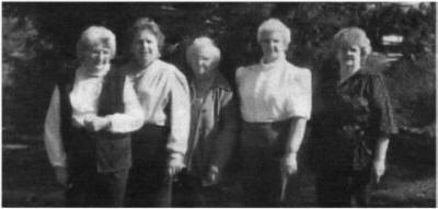 | On Myrtle’s birthday (March 12, 1983) – From left: Thelma Smith, Clara Jo Brown, Helen Slaven, Thelma Vincent, and Myrtle Burchett | |