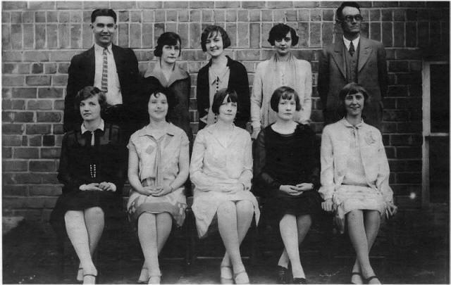 ![]() Robbins High School Faculty (1929) – Seated, from left: Wilma Collier, Miss Human, Leola Robbins, Ethel Justice, and Ethel Walker. Standing: John Lee West, Maud Madden, Lena Smithers, Miss Carey, and Prof. Robert R. Vance. |