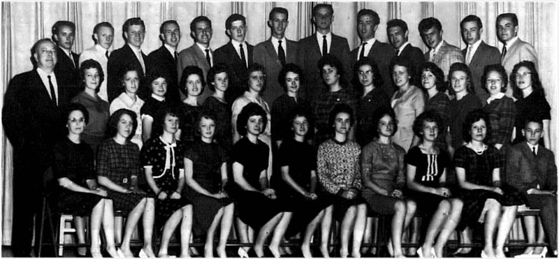 ![]() 1962 Senior Class Picture – Members of Robbins High School's Class of 1962 pose on stage at the school just prior to graduation. First row, fom left: Louise Silcox, Mary Taylor, Patsy Burch, Wanda Vanderpool, Jeanie Wright, Mary Etta Ellis, Dean Byrd, Sandra Griffith, Carol Pryor, and Jimmy Moffett. Second row: Taskel Welch (teacher), Louise Mills, Earnestine Voiles, Rose McCartt, Myma Kay Robbins, Dana King, Sue Human, Darlene Blair, Mary Elizabeth Sexton, Dorothy Griffith, Lois Wright, Ruth Silcox, Fay Henderson, Francis Storey, and Jeanette Pemberton. Back row: Jimmy Shoemaker, Ray Henderson, Warren Lee Branim, Houston York, James Marlow, Donald Young, Frank Newport, Howard' York, Sam Storey, Harold Myers, Teddy Lindsay, Donald Newport, and Harold Stephens. Also graduating with this class but not pictured was Elizabeth Voiles. |