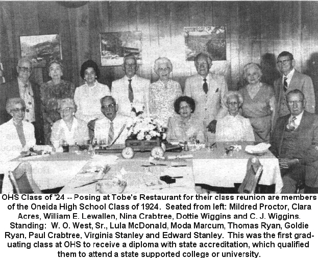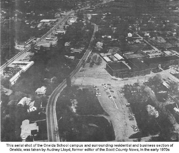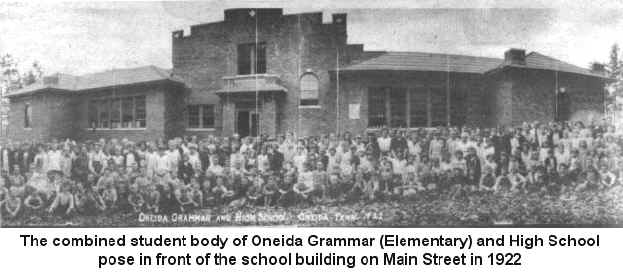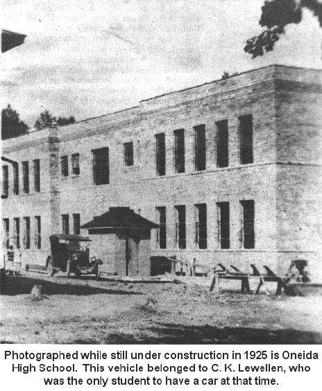 From 1901 to 1920 Oneida High School's first home was located in a two-room building (a third room was added later) on the grounds formerly occupied by the Litton School, which was the first school in the county. The site was just behind the old Conatser store building that burned on Main Street, near the present location of Westminster Apartments.