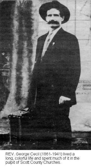 (FOOTNOTE — Among the local descendents of Rev. GEORGE W. CECIL are: the children of RANS (Loranzo) CECIL. MAE LAY, WILDA SPECK, BELLE CECIL and THELMA GRANDSTAFF. The children of MAE LAY: MARCY SWAIN and CECIL LAY. Children of MARCY SWAIN: MiCHAEL SWAIN, ANNE GALLAGHER, MISSY WALLEN, CATHY CAMERON, NANCY WATTERS and TIM SWAIN. CECIL LAY’s son is CHRISTOPHER B. LAY. WILLIAM HAMILTON is the son of BELLE CECIL. His children are: JEANENNE STEWART, BILL HAMILTON, PHILIP HAMILTON and VALERIE LeMARR. Rev. VIRGIL CECIL was the son of Rev. REUBEN CECIL. Children of Rev. VIRGIL CECIL: MILFORD, WENDELL, ROGER and VAUGHN. KAY SANDRA SEXTON TABAKA is the daughter of ARCHIE ALTON SEXTON and ANNA KENYON CECIL, who was the daughter of BURG CECIL and MINNIE BLEVINS CECIL).