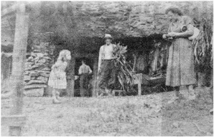 Crusoe West (center) and Dorothy Calahan (right) at the entrance to the cave-home on Pine Hill. Although thoughts of living in a cave might seem harsh to some, it was really quite comfortable, their children recall. |