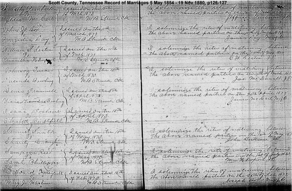 | Tucker, Johnson | Bowling, Lucinda | 13 Mar 1873 | 14 Mar 1873 | ||