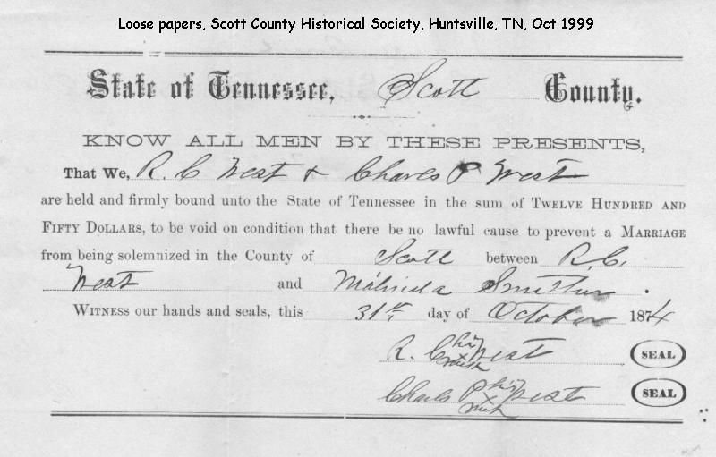 | West, R. C. | Smither, Malinda | 1 Nov 1874 | |||