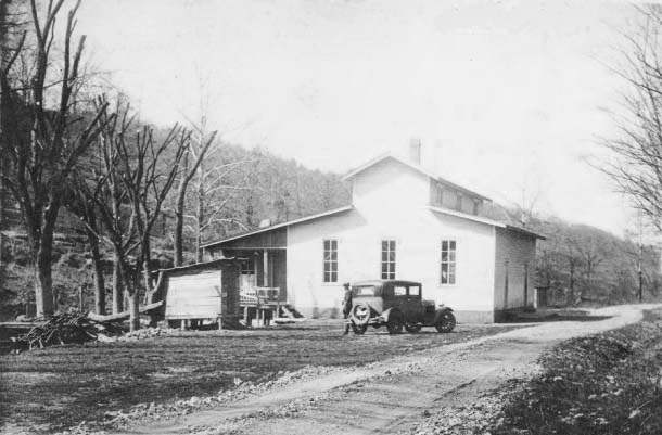 of 1928 and had a sawdust floor. Ed Hunt shown with car.
