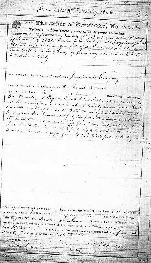 the said Jeremiah Gregory and his heirs forever. In witness whereof, Newton Cannon Governor of the State of
