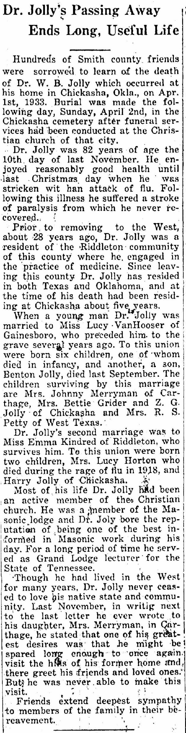 Obituary of Dr. W. H. Jolly from the CARTHAGE COURIER, April 13, 1933. Please note that
