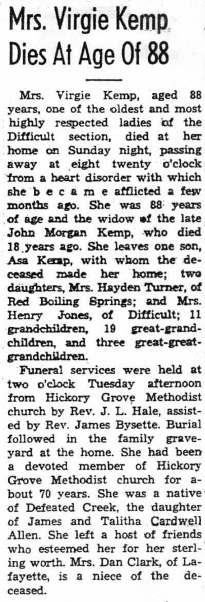 Go To John M. and Virgie Allen Kemp Family Pictures