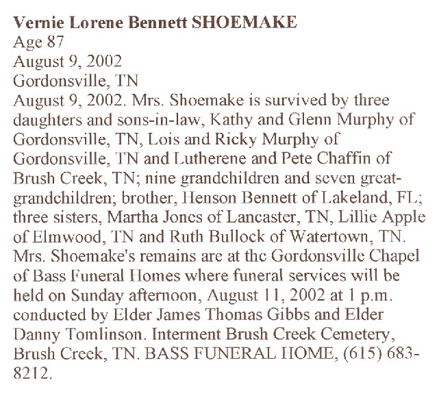 Vernie Lorene Bennett Shoemake Obituary