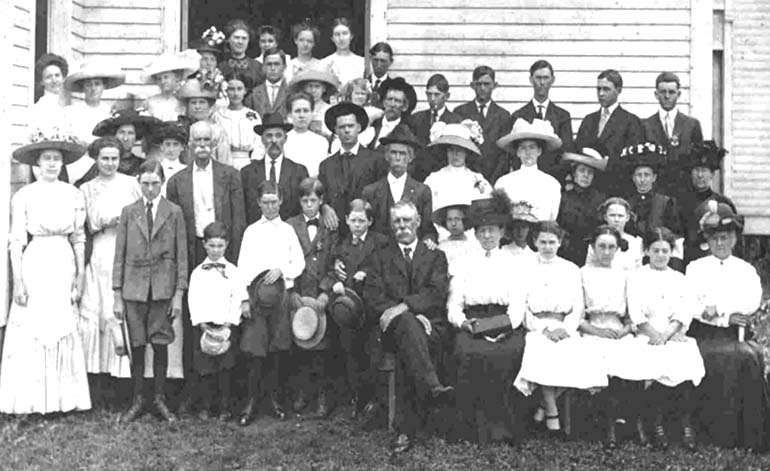 Woman at left in doorway, without a hat, is Della Moore Bruce. Man in