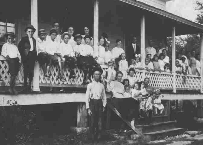 Mrs. Billy (Annie) Moore is sitting on the steps on the right with Annie