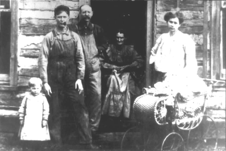 Jincey is pictured in the door way of her log home in Illinois with her son (with pipe) James