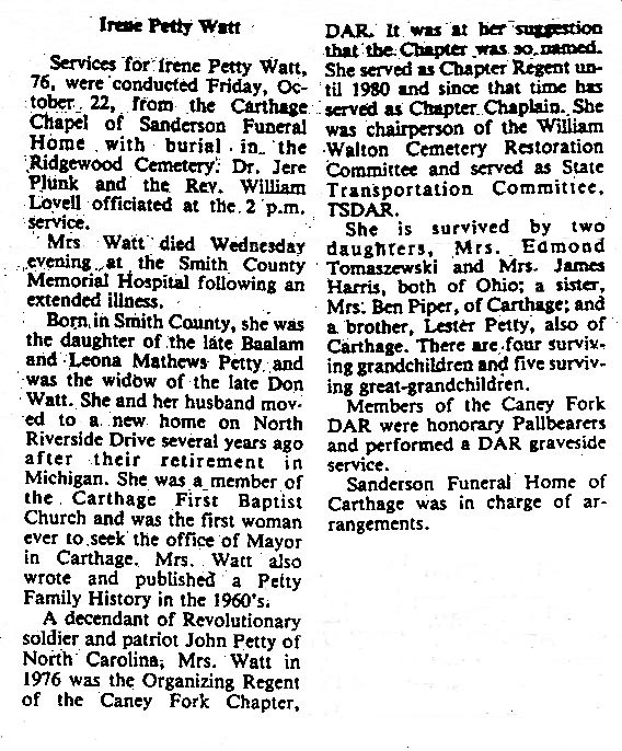 Irene Petty Watt died Oct 20, 1982. Irene Petty and