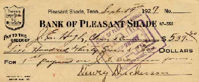 Below is a cancelled check of 75 years ago drawn on the "Bank of Pleasant Shade". Dewey Dickerson,