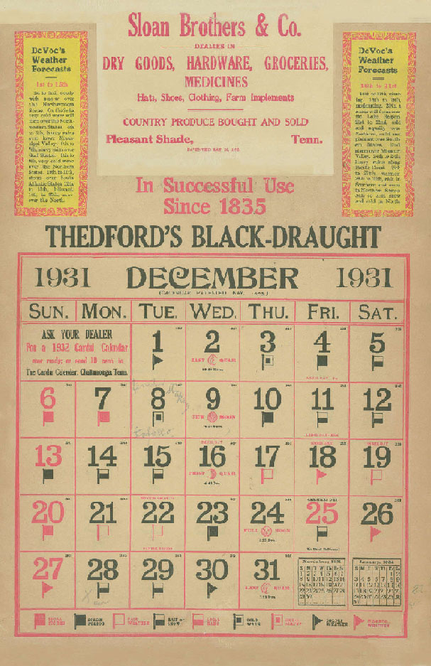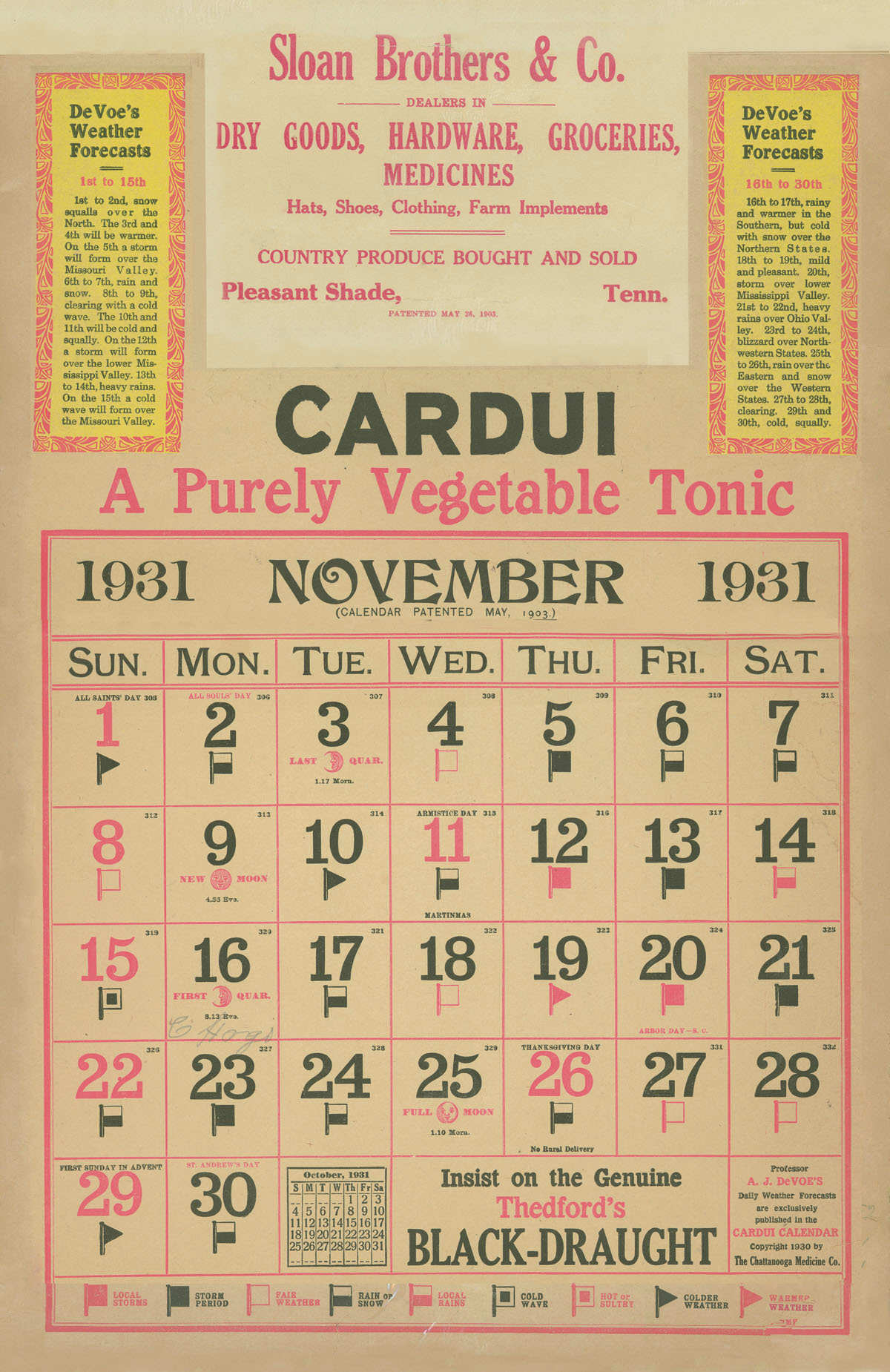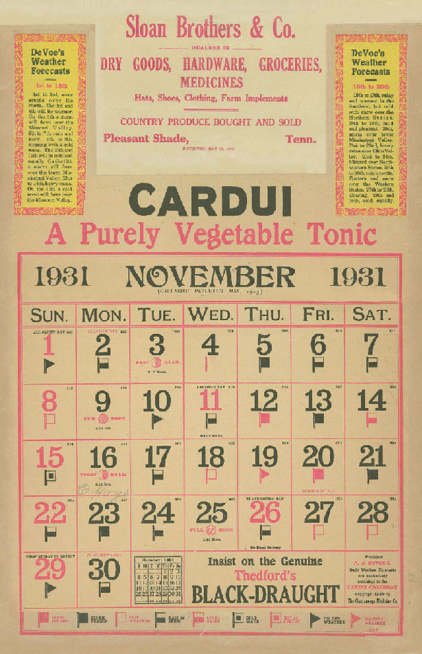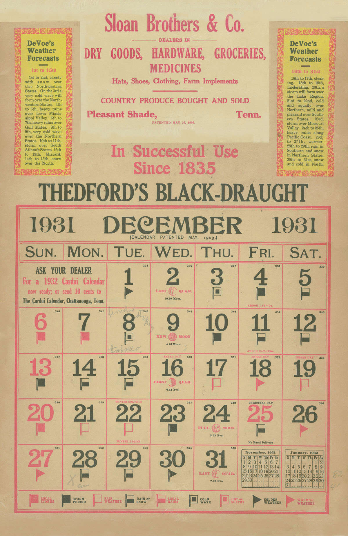 Advertisements were also common on these calendars with "Black-Draught" and "Cardui"