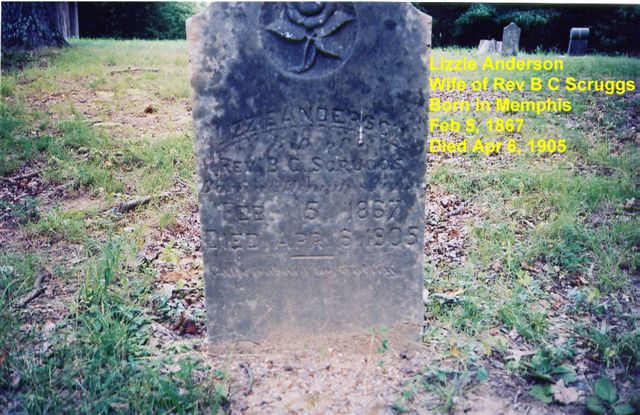 Lizzie Anderson Scruggs, wife of Rev. B. C.. born in Memphis February 15, 1867, died Apr. 6, 1905